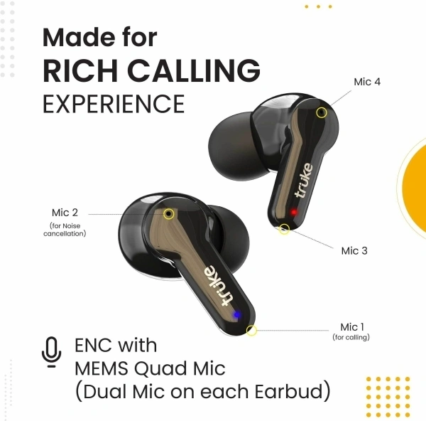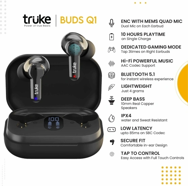 Truke Buds Q1 with Environmental Noise With Mic:Yes Bluetooth version: 5.1 Wireless range: 10 m Battery life: 72 hrs | Charging time: 1.5 hrs 7 Days Replacement Policy